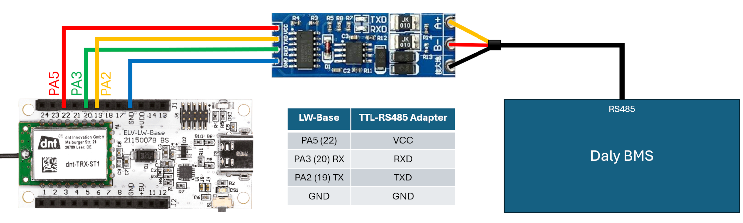 Die LW-Base kommuniziert mit dem Daly BMS seriell. Dafür werden die Pins PA2 (TX) und PA3 (RX) verwendet. Ein Schnittstellenwandler konvertiert die Spannungspegel zwischen TTL und RS485.