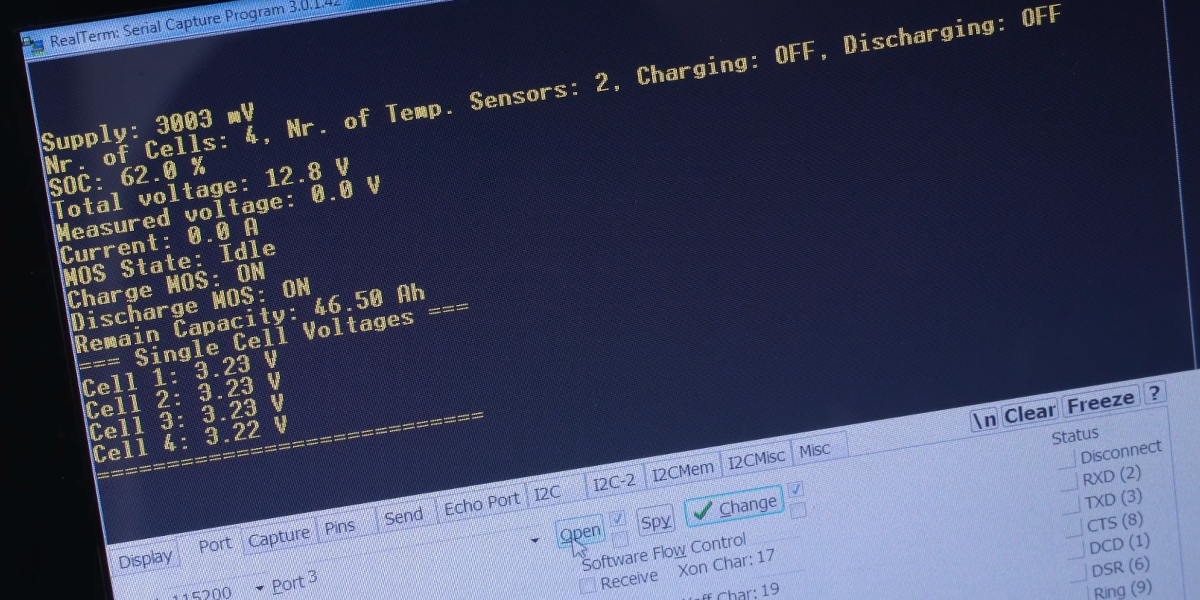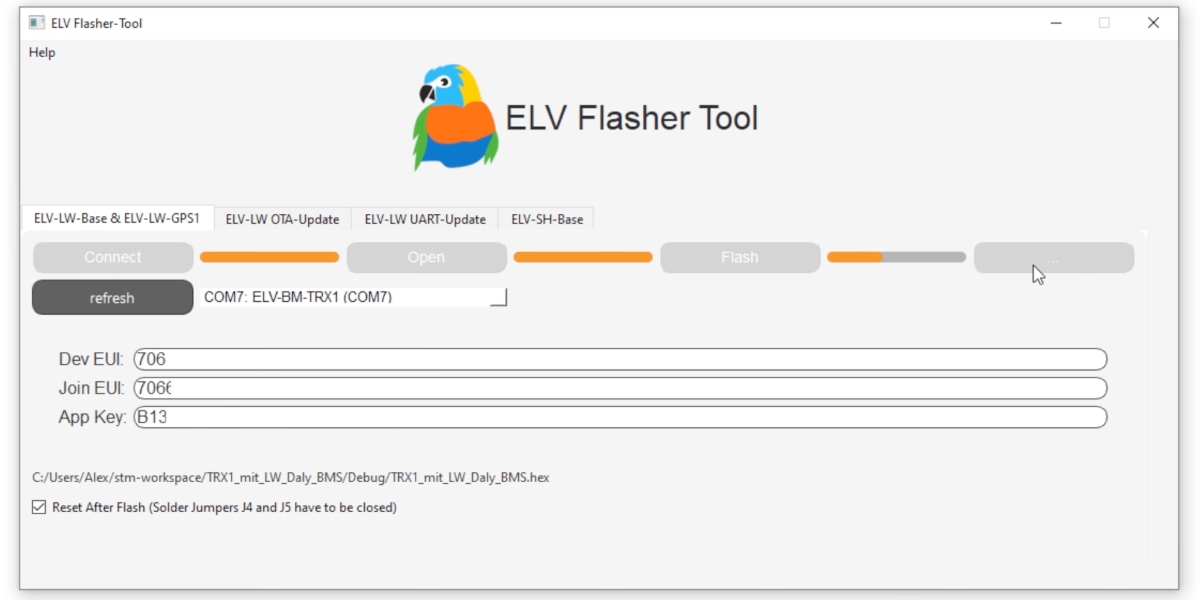 Über das ELV Flasher Tool wird die gewünschte Firmware auf das Board geladen. Im ZIP-Ordner befindet sich ein Testprogramm, welches das Daly BMS ausliest und die Daten über die serielle Schnittstelle ausgibt. Die Baud-Rate beträgt 115200. Funktioniert das Testprogramm, so kann im Anschluss die Firmware für die LoRaWAN Unterstützung hochgeladen werden.